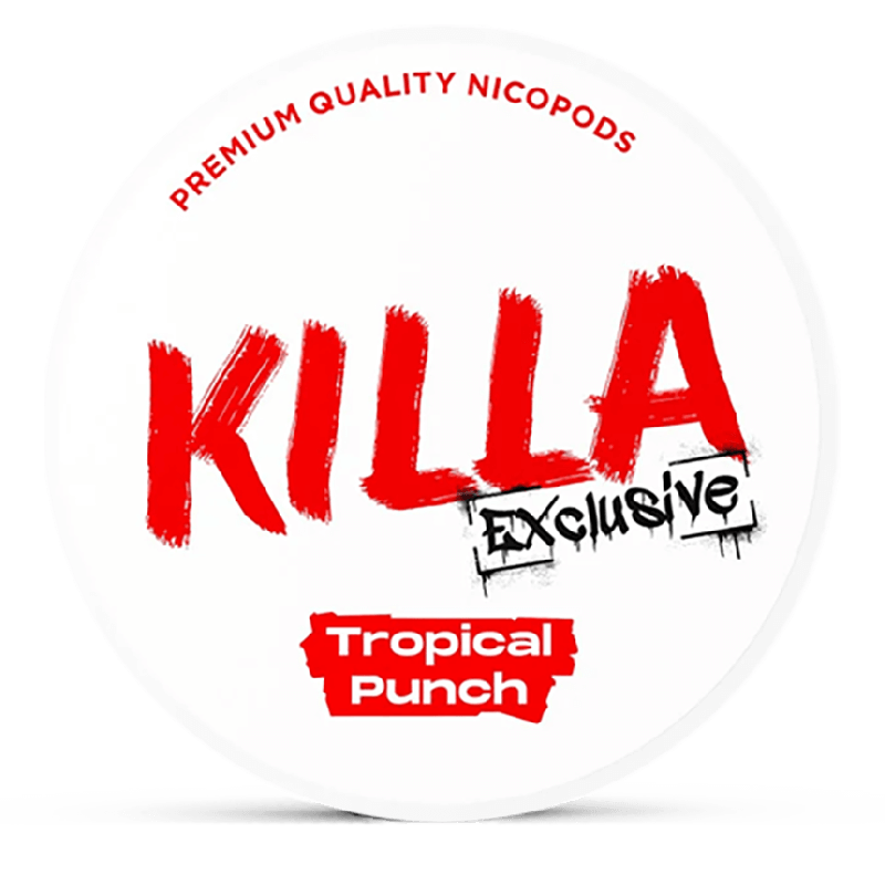 Killa Exclusive Tropical Punch offers a vibrant tropical mix bursting with exotic, juicy flavor in every pouch.