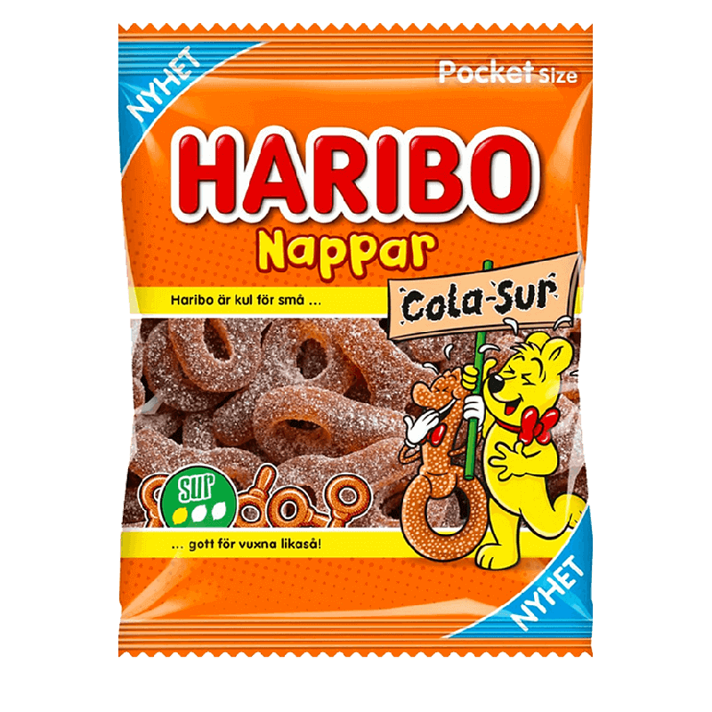 Haribo sour cola pacifiers provide a refreshing experience! The chewy but soft jelly pacifiers have a distinct taste of classic cola but they are dipped in sour sugar which gives the flavor a lovely injection. In recent years, this product has become one of the Swedes' biggest favorites!