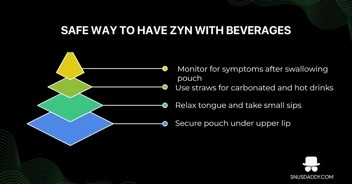 Accidental swallowing can happen with any beverage, but it isn't dangerous for most people. If you swallow a ZYN pouch while drinking anything, monitor yourself for symptoms like nausea or stomach discomfort.