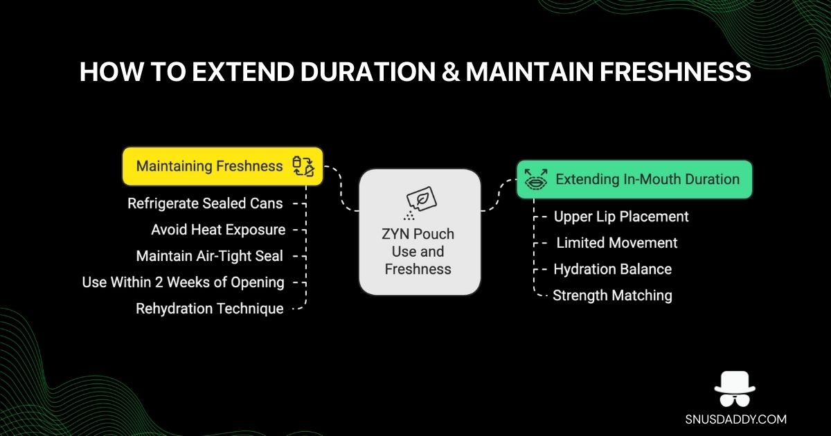 - Key Duration Factors: Dry mini formats, lower strength (3mg), upper lip placement, and fresh pouches all extend duration significantly