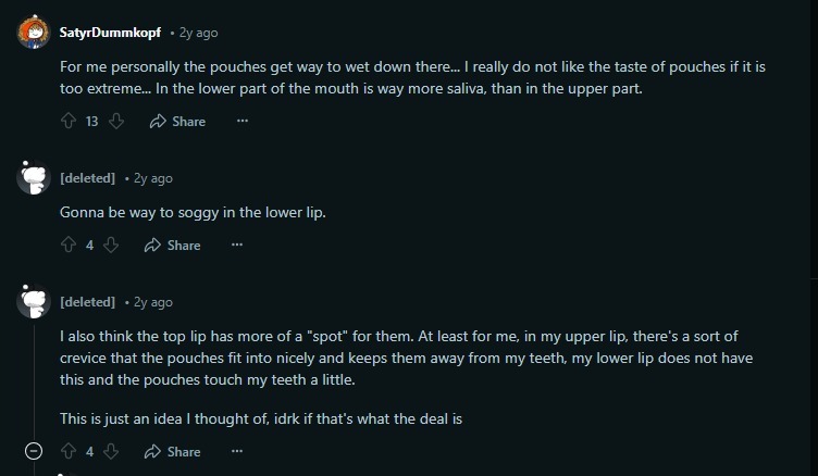 Also, your upper lip causes less irritation because it has more space and fewer nerve endings than the lower area. Lower lip placement puts the pouch too close to sensitive tissue and major salivary glands.