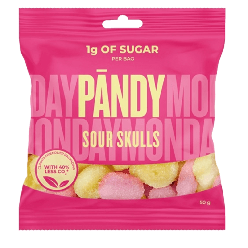 Fruity skull shaped foam gummies blending sweet raspberry and tangy lemon. Only about 1 g sugar per bag. High in fiber and gluten free but made with bovine gelatin so not vegan.