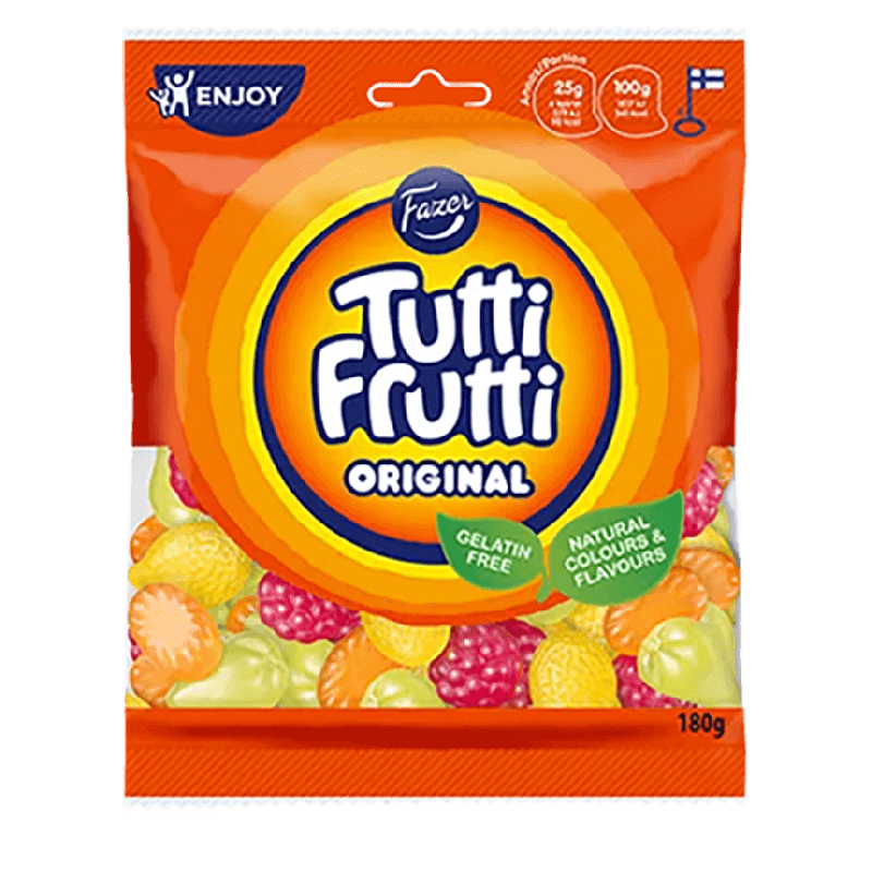 Tutti Frutti is one of the Swedes' favorite candy bags with soft, fresh and fruity jelly candy and flavors from apple, pear, raspberry and lemon that lasts a long time in its taste. The small jelly sweets are shaped like different fruits in the colors yellow, green, red and orange. Tutti Frutti original is a gelatin-free vegan product made with natural colors and flavors. Its fresh taste is produced from natural juices and colors from both fruits and vegetables. Simply a product for the conscious consumer! It is suitable for candy lovers of all ages and for most situations such as at the party, in the car, in front of a series on the TV couch or just anytime when sweet cravings arise.